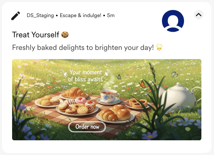 | A vibrant, Ghibli-inspired scene of a picnic in a meadow, featuring a mouth-watering spread of fresh pastries and steaming tea. Add text for Banner: “Your moment of bliss awaits” and CTA: “Order now” |  |