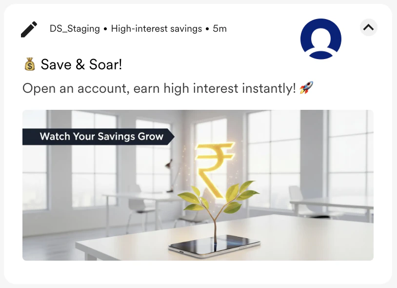 | A clean, 3D visualization of a sapling with glowing Rupee symbols for leaves, growing out of a mobile screen. Minimalist and tech-savvy aesthetics with a prominent banner: “Watch Your Savings Grow.” |  |