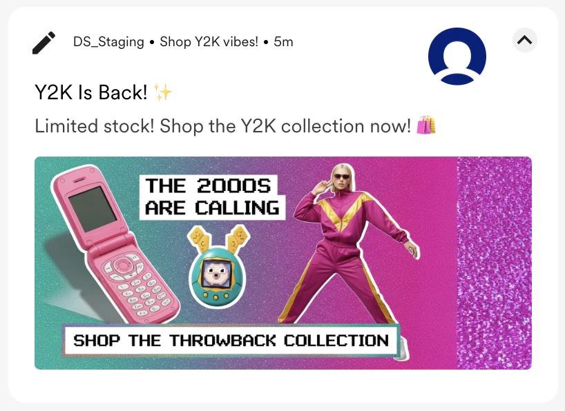 | A Y2K-inspired collage with a flip phone, Tamagotchi, and a model in a vibrant tracksuit. Bold, pixelated font. Add text for Banner: “The 2000s are calling,” And CTA: “Shop the throwback collection.” |  |