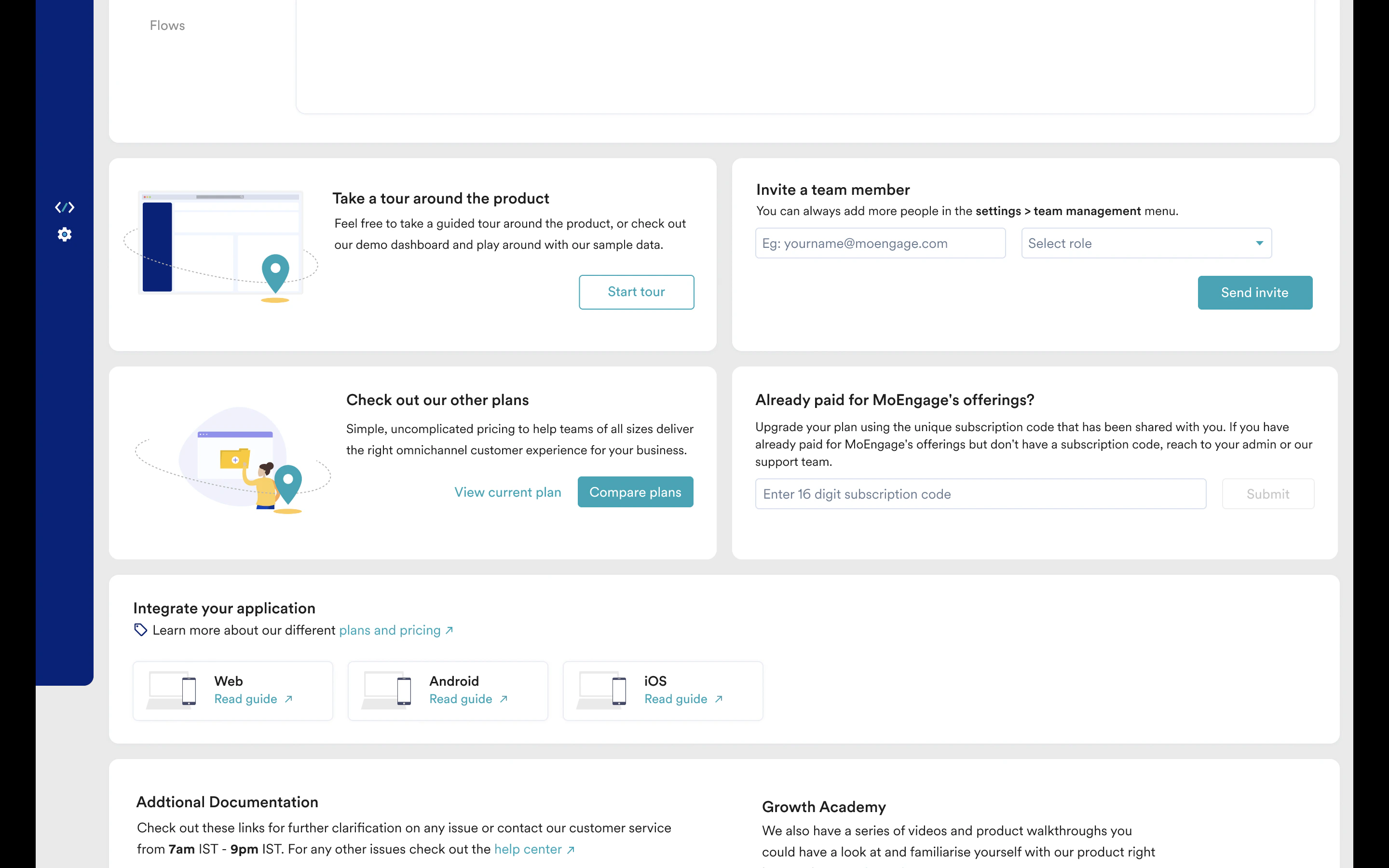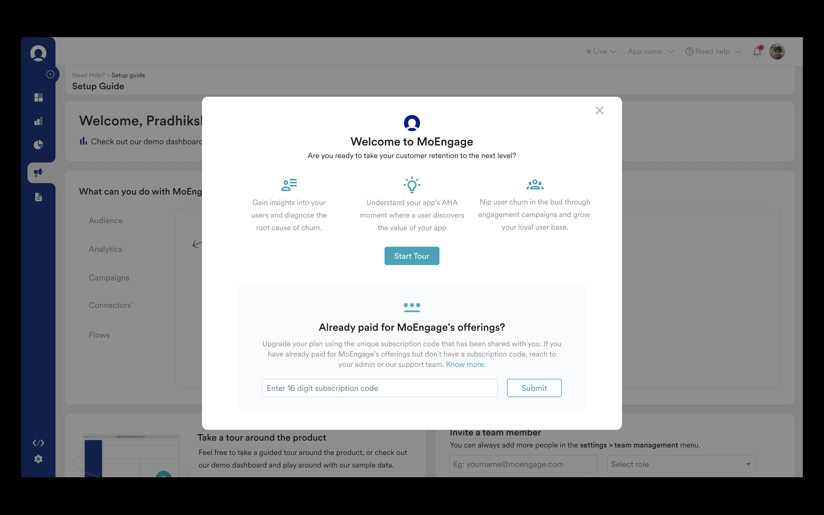Step 1: Click on the “Need help” dropdown in the top right corner and click on “Setup Guide” Step 2: Enter the Subscription Code and click on Submit.
