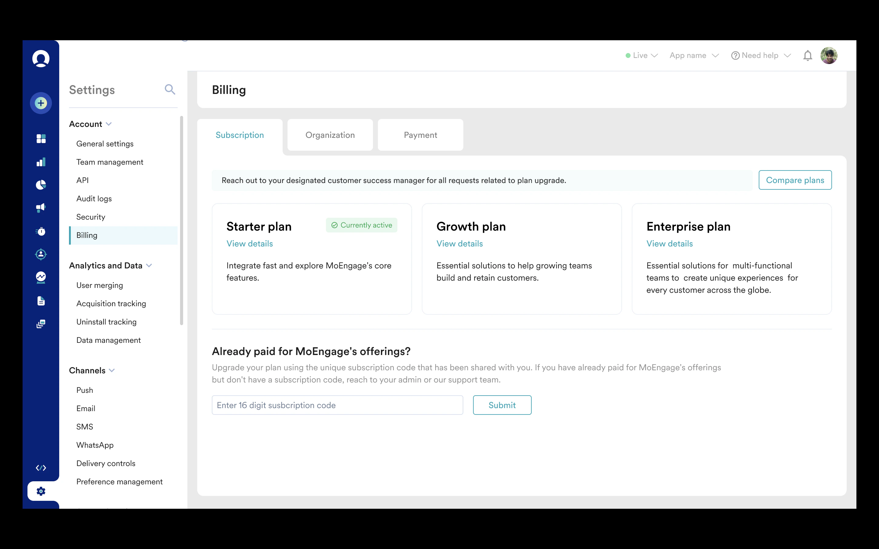 Step 1: Click on Settings -> Billing Step 2: Select the Subscription tab (open by default). Click on the “Compare plans” button to compare different plans offered by MoEngage and the “View details” button for a specific plan to view the detailed list of features.