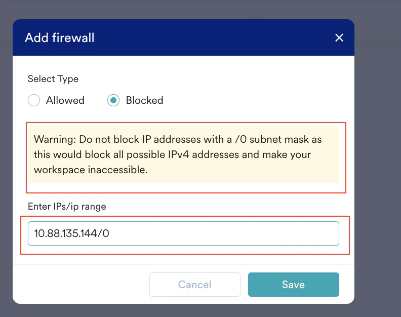 - Blocked: Select this option to blacklist any IP. You can add specific IP addresses or ranges and block their access to the MoEngage dashboard. Connections originating from these IPs are effectively blocked from accessing the MoEngage dashboard. If users attempt to log in from a blocked IP address, their login will fail.