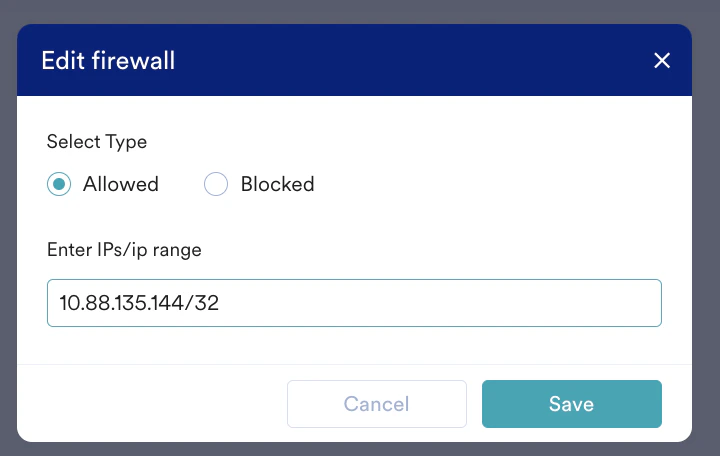 - Allowed: Select this option to whitelist any IP. You can add specific IP addresses or ranges and grant permission to access the MoEngage dashboard. Only connections originating from these IPs will be successful. This is a security measure to restrict access to authorized users and networks, such as your office or a designated VPN.