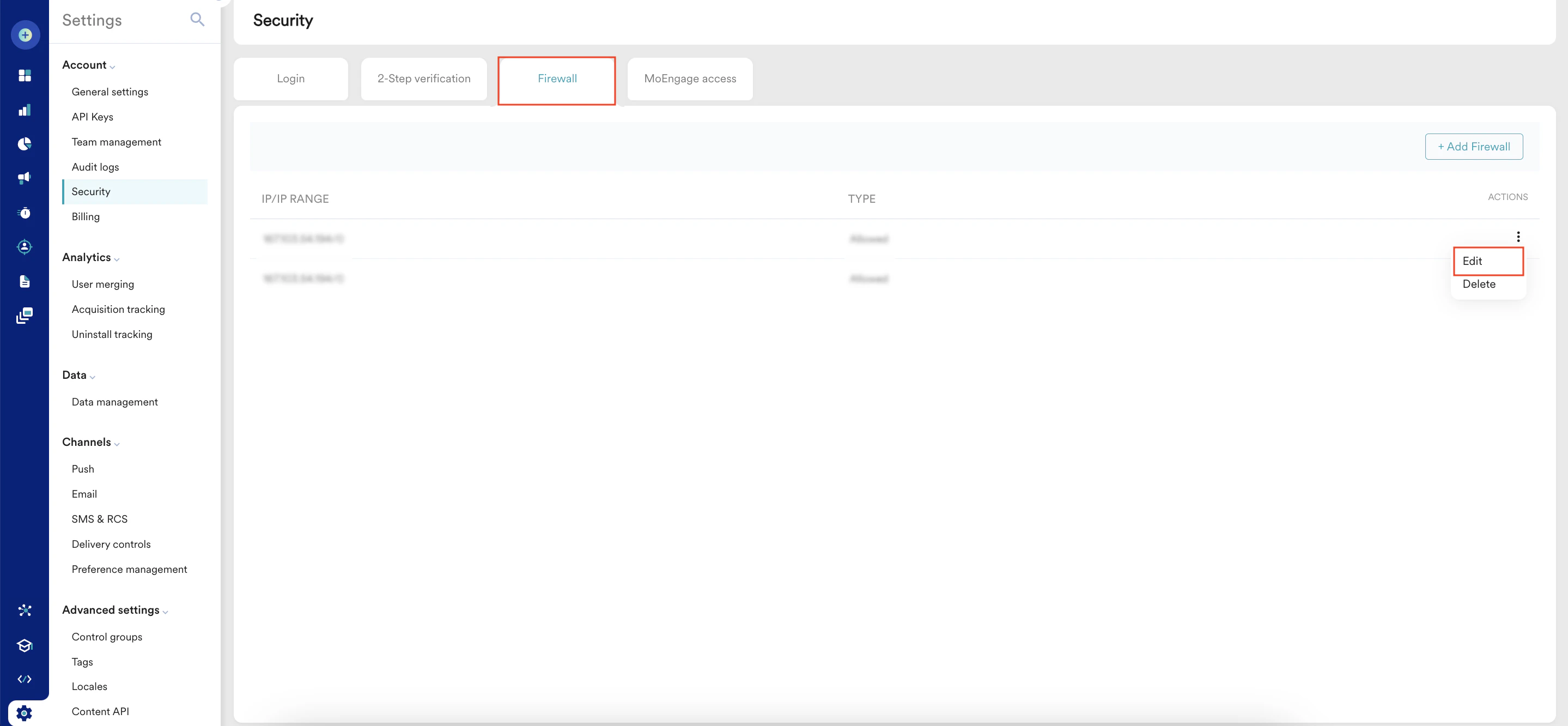 Perform the following steps to add a firewall:- On the left navigation menu in the MoEngage dashboard, click Settings > Account > Security.