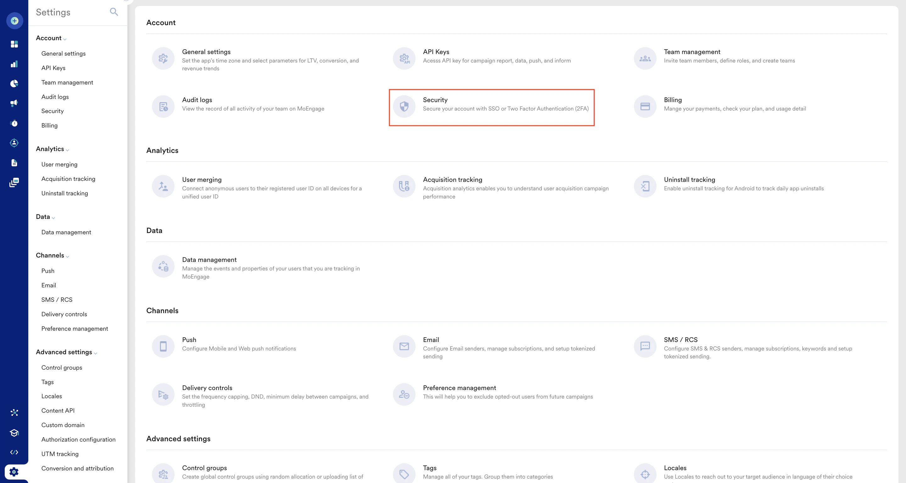 - On the left navigation menu in the MoEngage dashboard, click Settings> Account > Security.