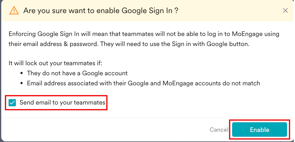 The Are you sure want to enable Google Sign In ? pop-up window will appear, prompting you to review the instructions carefully. - Select the Send email to your teammates check box.