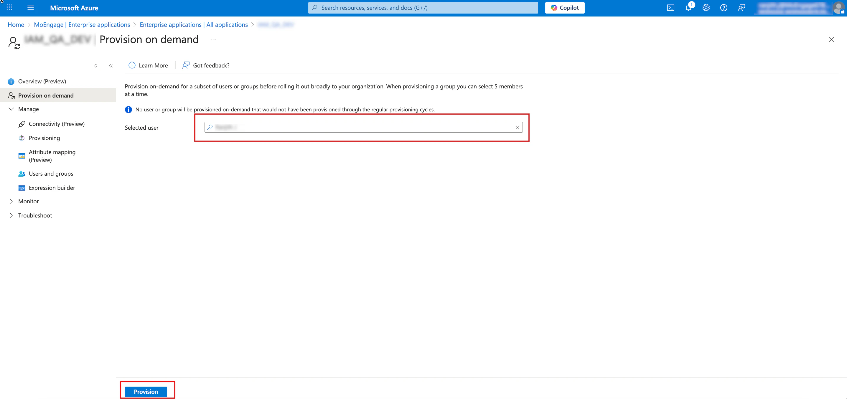 Manual force sync ensures that mapped properties and roles are updated instantly across all assigned users.- Click the Provisioning tab, and in the left navigation pane under Settings, click To App.