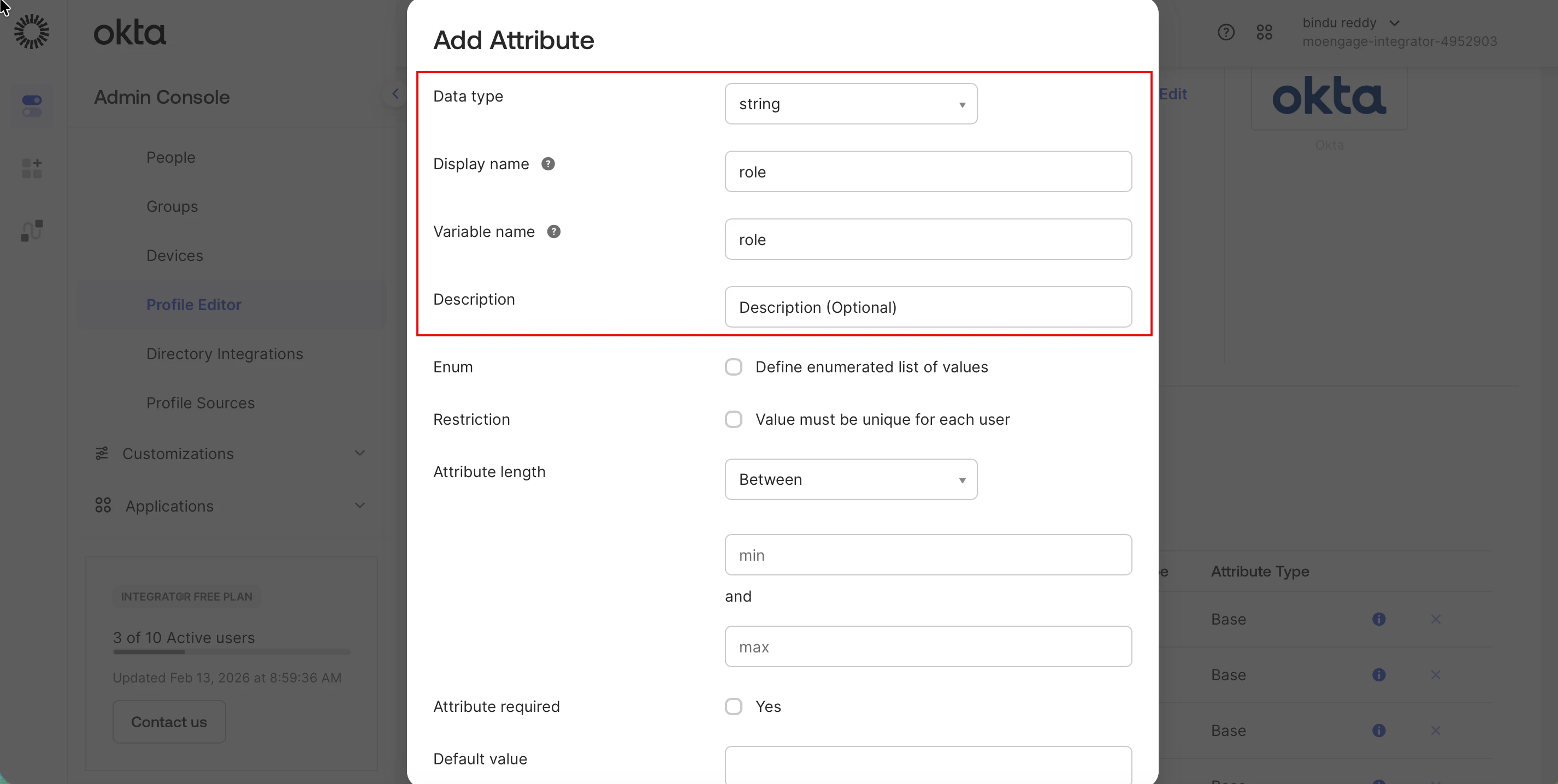 Grant specific write permissions in Okta and map the role attribute to help ensure that users are provisioned with the correct permissions in MoEngage. You must create roles in MoEngage to assign them to users correctly. This attribute mapping helps ensure that users receive their intended access levels rather than the Default role that was configured earlier.Step 6.1: Configure Profile Attributes
