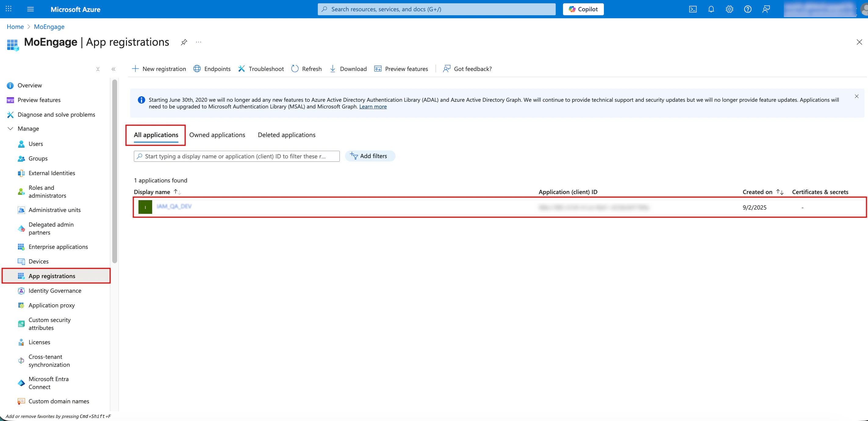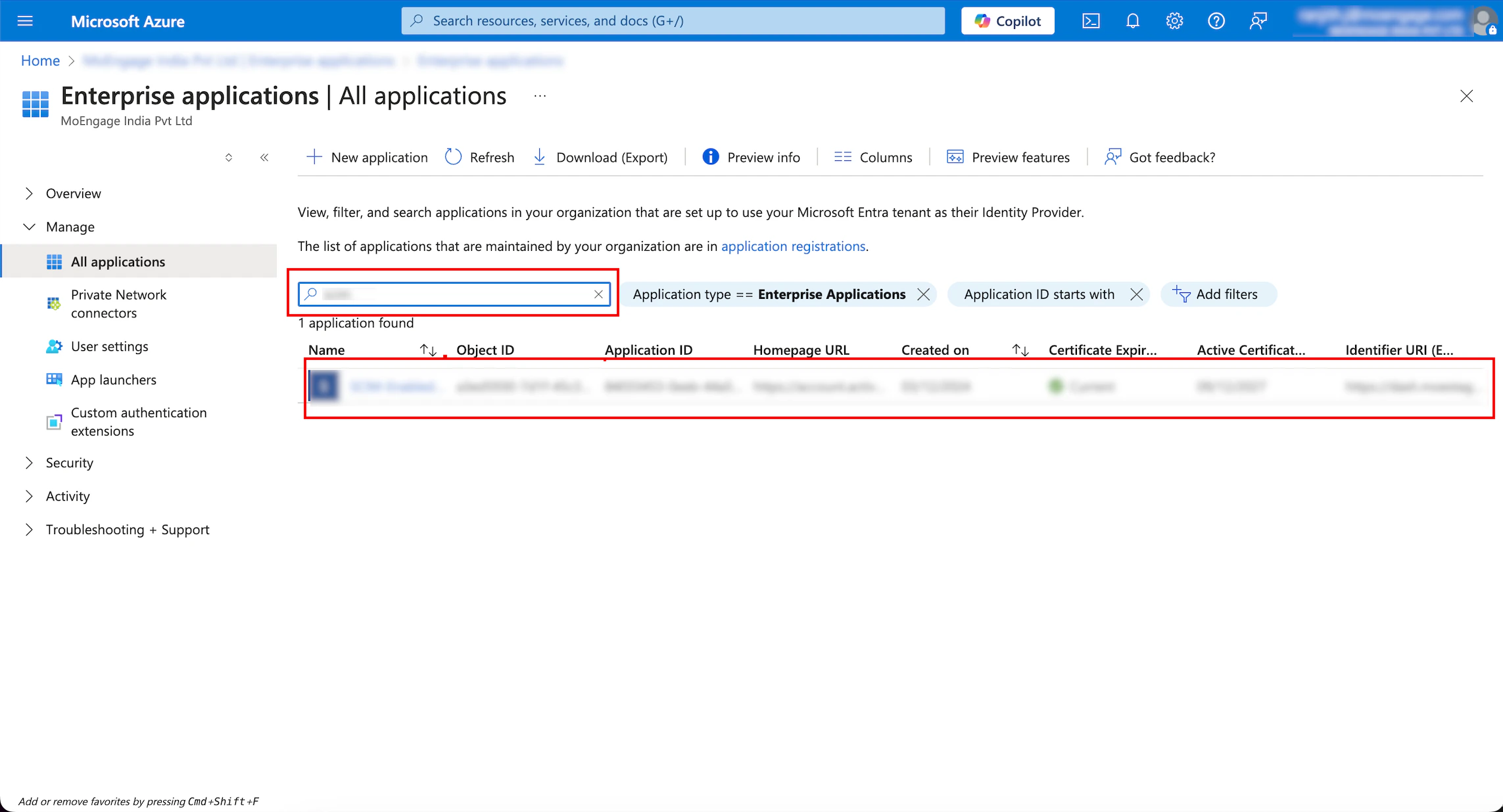 - On the Applications page, find your application in the list or use the Search for people, apps, and groups box to find it.