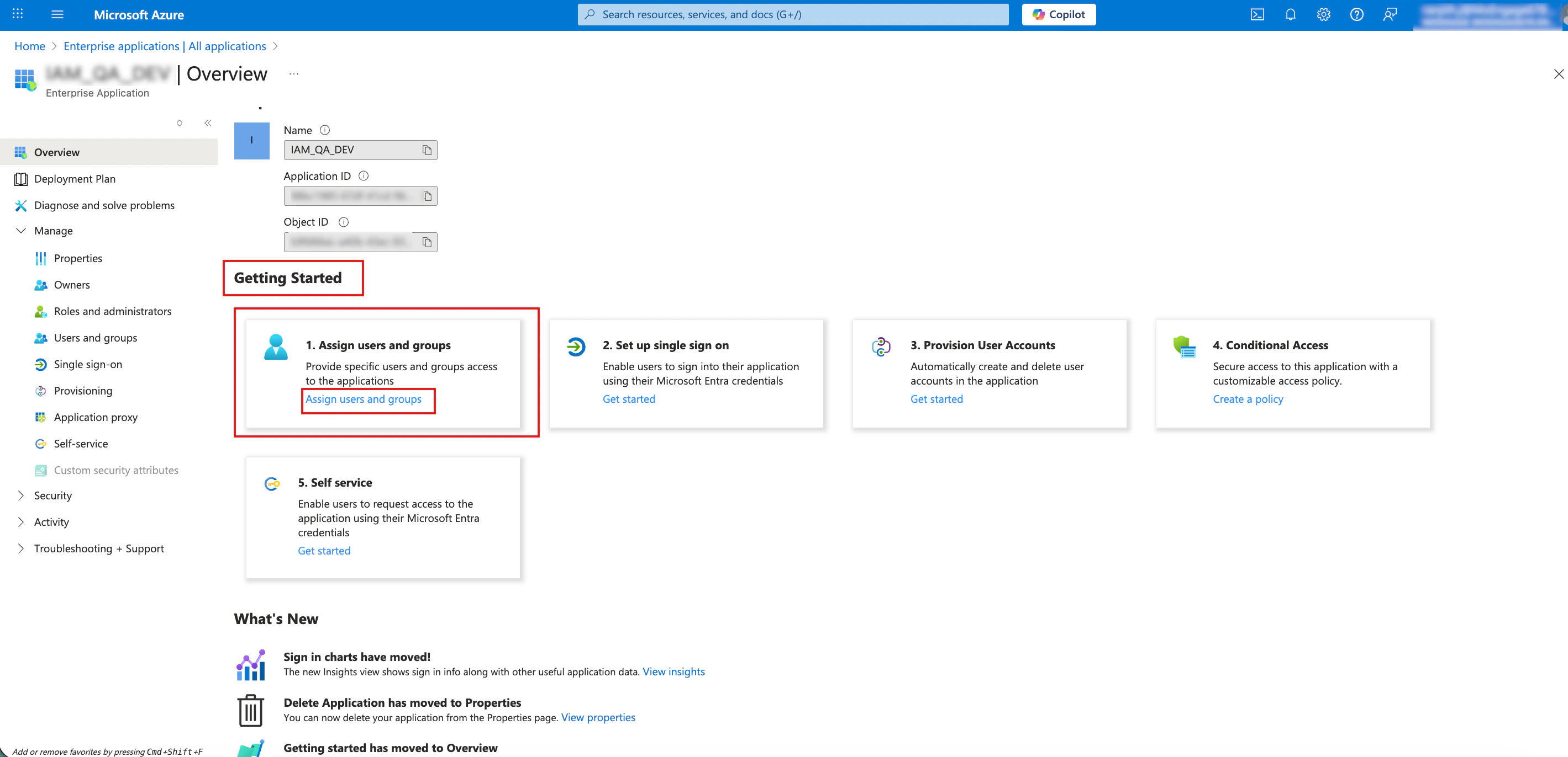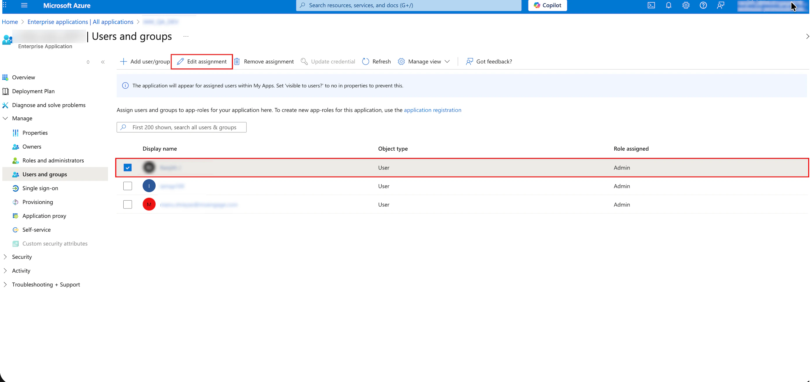 After Microsoft Entra ID successfully updates the user, the Application assignment succeeded message appears in the upper-right corner.