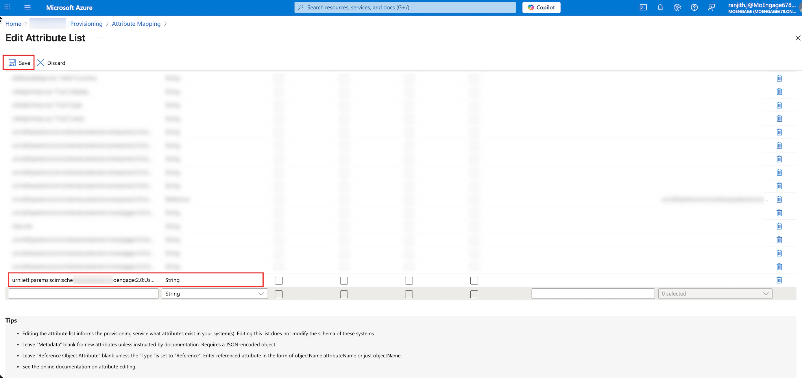 - In the External namespace, enter urn:ietf:params:scim:schemas:extension:moengage:2.0:User