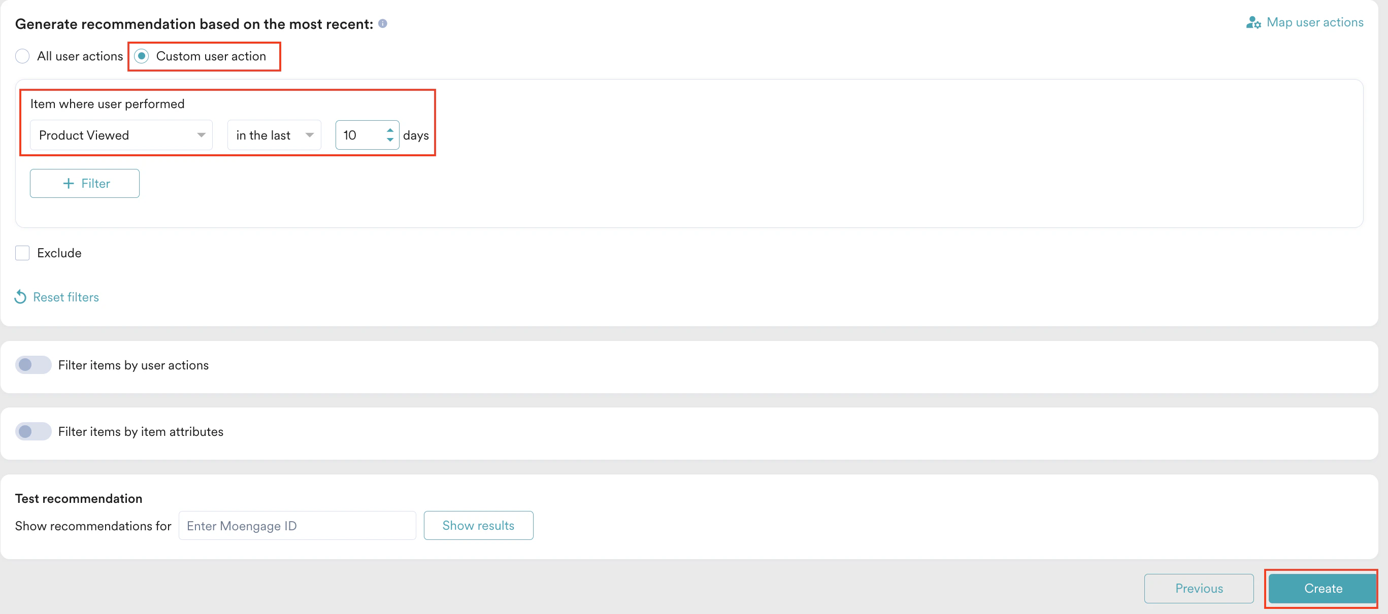 - Under Generate recommendations based on the most recent, select Custom user action. In the Item where user performed list, select Product Viewed.