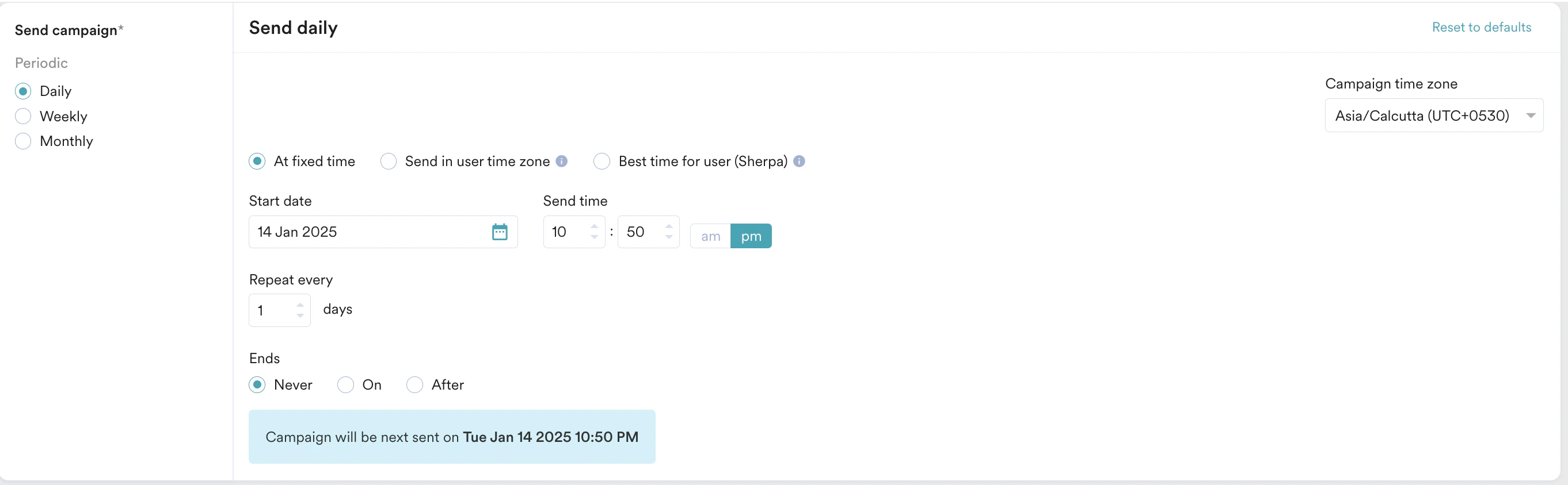 - Click Next to move to the third step, Schedule and goals, where you can define your campaign’s schedule and goals.