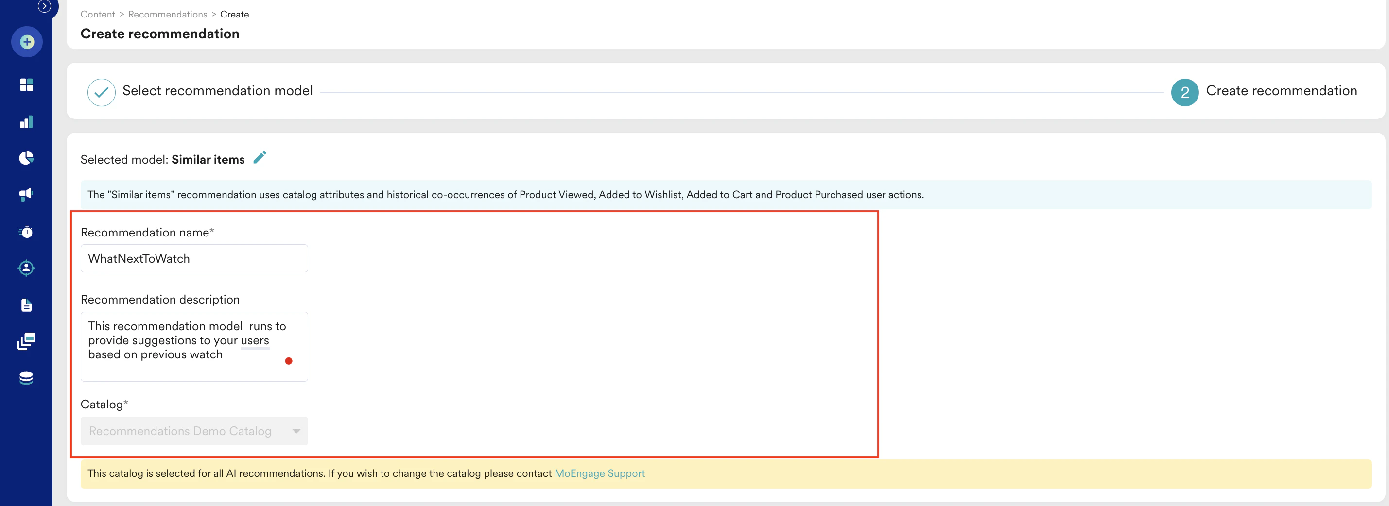 - Catalog: Select the catalog to which the recommendation is to be applied. In this example, we will select Recommendations Demo Catalog.